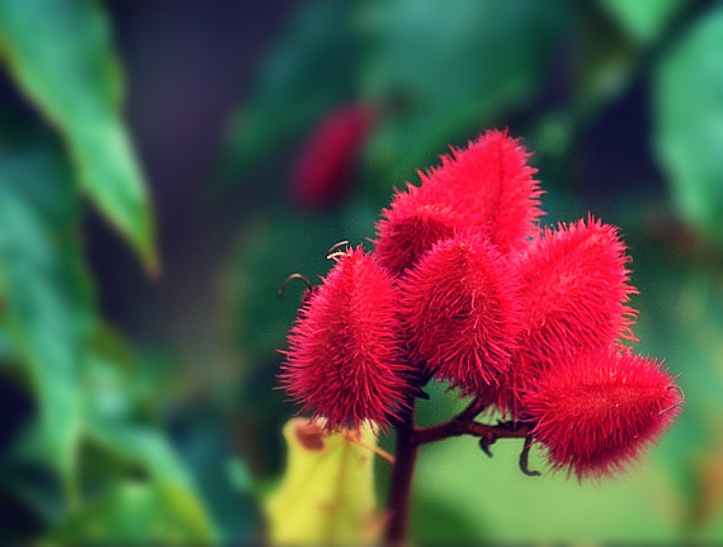 Originário da América tropical e com distribuição pelos estados brasileiros do Amazonas, Maranhão, Ceará e Bahia, o urucum (Bixa orellana) é um arbusto de folhas largas e flores rosadas. Os frutos são pequenos ouriços, recobertos por espinhos maleáveis. Quando amadurecem, exibem sementes vermelhas, tradicionalmente utilizadas por indígenas de diversas etnias para pinturas corporais e proteção da pele contra picadas de insetos.