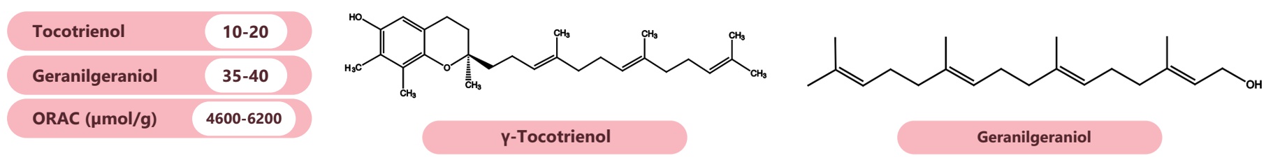 Annatto is one of the few known sources of tocotrienol, with proven superior antioxidant action. Additionally, Geranylgeraniol, present in the complex, has demonstrated anti-inflammatory properties, potentially aiding in the management of obesity and comorbidities. The combined action of tocotrienol and geranylgeraniol leads to the reduction of serum cholesterol levels by inhibiting the HMGCoA reductase enzyme.